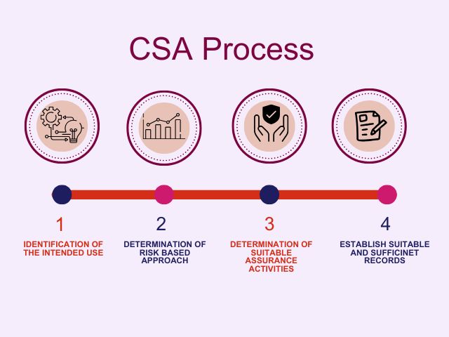 The four steps involved in the CSA frameworks are identification of intended use, determination of risk-based approach, determination of assurance activities and establishing suitable records.