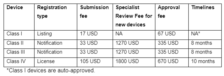 The applicant is required to submit the application along with the requisite documentation and the applicable review fees. The specific fees are determined based on whether the device falls into the listed, notified, or licensed category, each having its own corresponding fee structure.