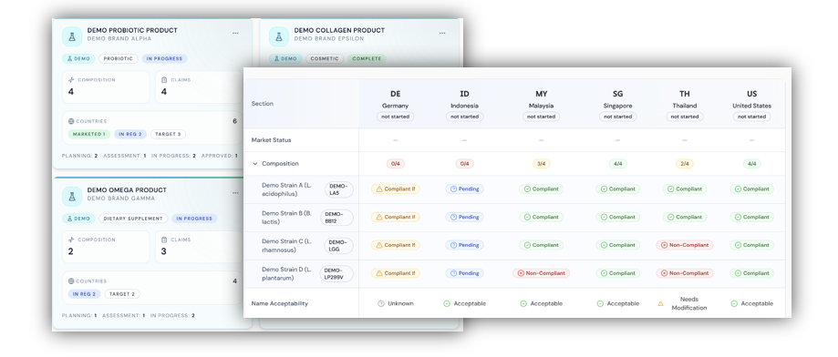 - Executive dashboard for global cosmetic compliance status